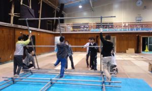 体育館のこの大きな舞台も、毎年学生が立てています。